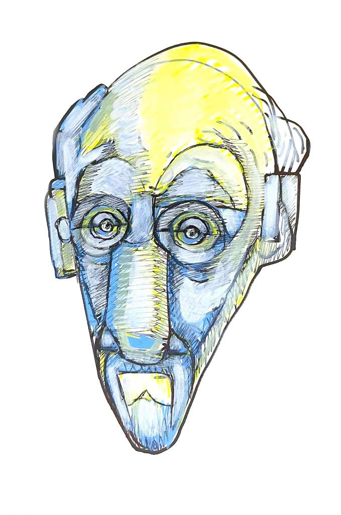 Portret balansuje na granicy człowieczeństwa i maski. Twarz – wydłużona, geometryczna, zmechanizowana – przywodzi na myśl zarówno archaiczną rzeźbę, jak i futurystycznego androida…