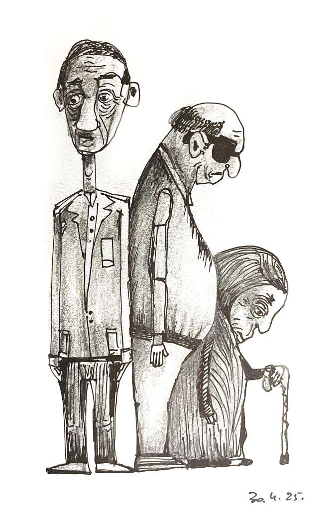 Ta praca różni się od pojedynczych portretów. Nie jest to pojedyncze oblicze, lecz cała konstelacja postaci. Trzy sylwetki – wysoki, chudy mężczyzna w garniturze, masywny mężczyzna w okularach…