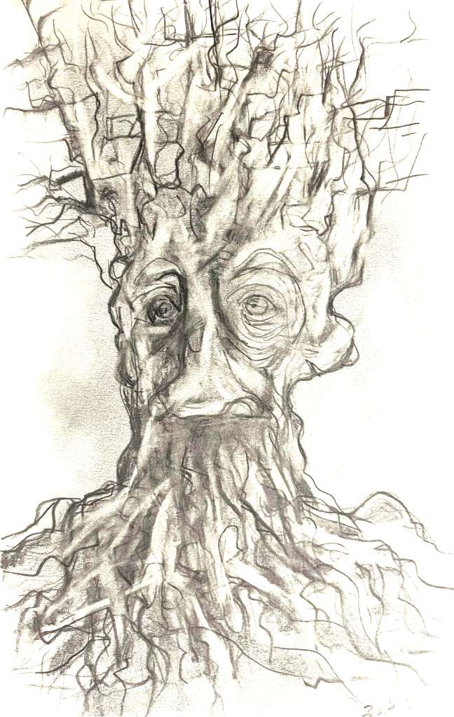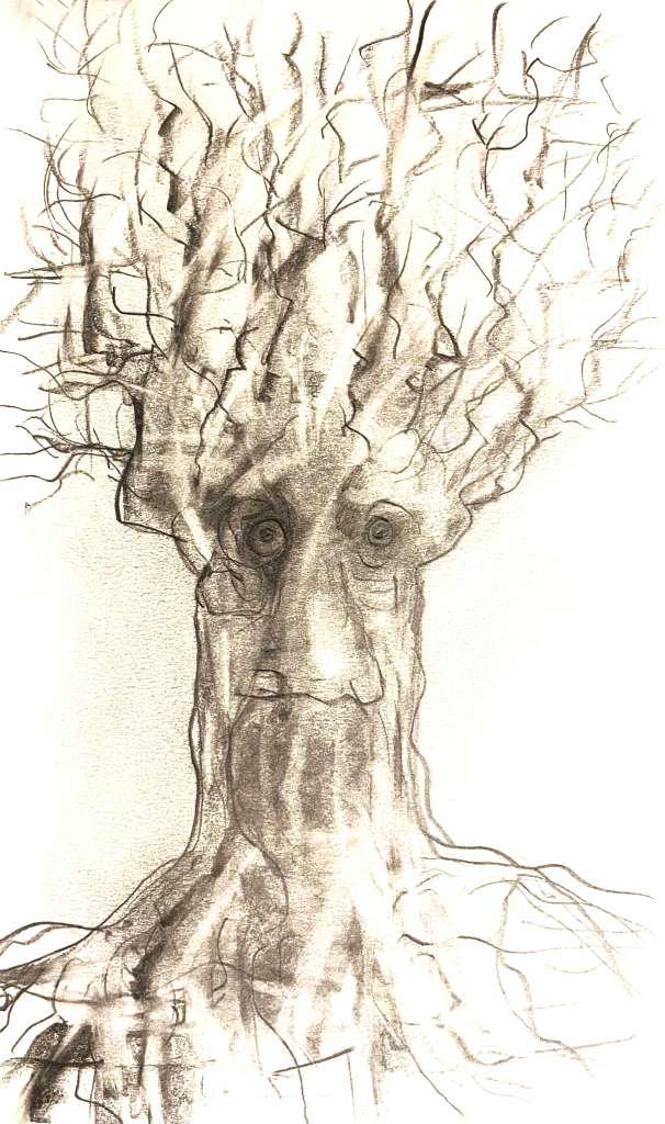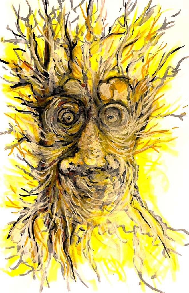 Wujek Marian” to portret–drzewo, w którym ludzkie oblicze i natura splatają się w jedną całość. Twarz wyrasta z konarów, a jednocześnie przechodzi w korzenie, jakby życie…